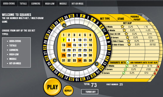 A Squares , vous cherchez à prédire entre 6 et 36 numéros. Toutes sortes de variantes de paris sont proposées. Entre 6 à 36 numéros sont tirés au sort par un générateur aléatoire. Les six billes sont toutes tirées au sort successivement. Comme dans le loto classique, vous pouvez ainsi comparer les numéros tirés avec ceux que vous avez choisis.
