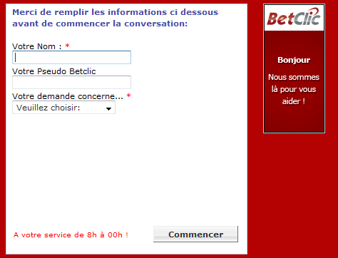 Pour joindre le support Betclic, vous pouvez utiliser le Chat gratuit disponible depuis le site internet du bookmaker : http://www.Betclic.fr. Le Live Chat de Betclic est disponible 7 jours sur 7, de 8h à 00h. Un conseiller répond à toutes vos questions concernant les Paris Sportifs, les Paris Hippiques ou le Poker. Grâce au chat de Betclic, vous pouvez discuter en Live avec un téléconseiller directement depuis votre ordinateur PC ou Mac.